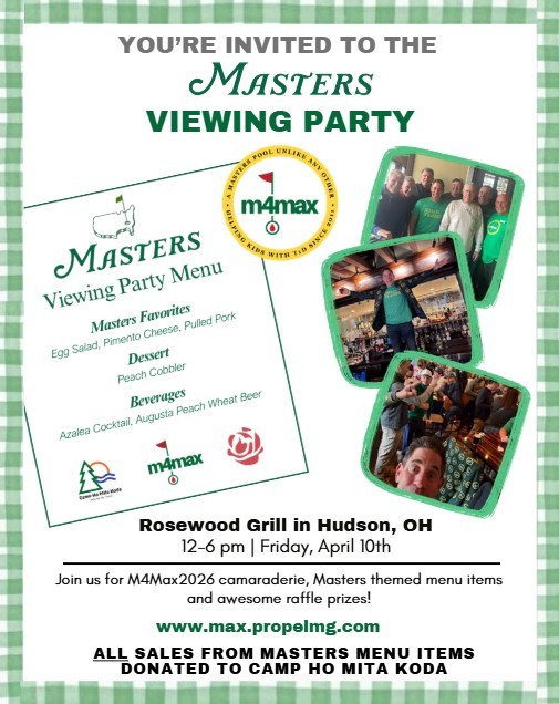 Sorry to break it to you this way, but once you enter the 2026 M4Max Challenge you are now required to attend our big Masters viewing party this Friday, April 10th from 12 – 6 pm at the Rosewood Grill in Hudson, OH (you really should have read the fine print). In all seriousness, there will be awesome Masters themed food and some fantastic raffle prizes for those who are able to stop in.